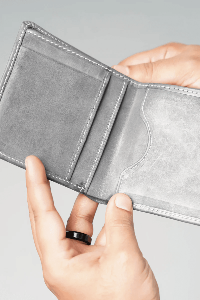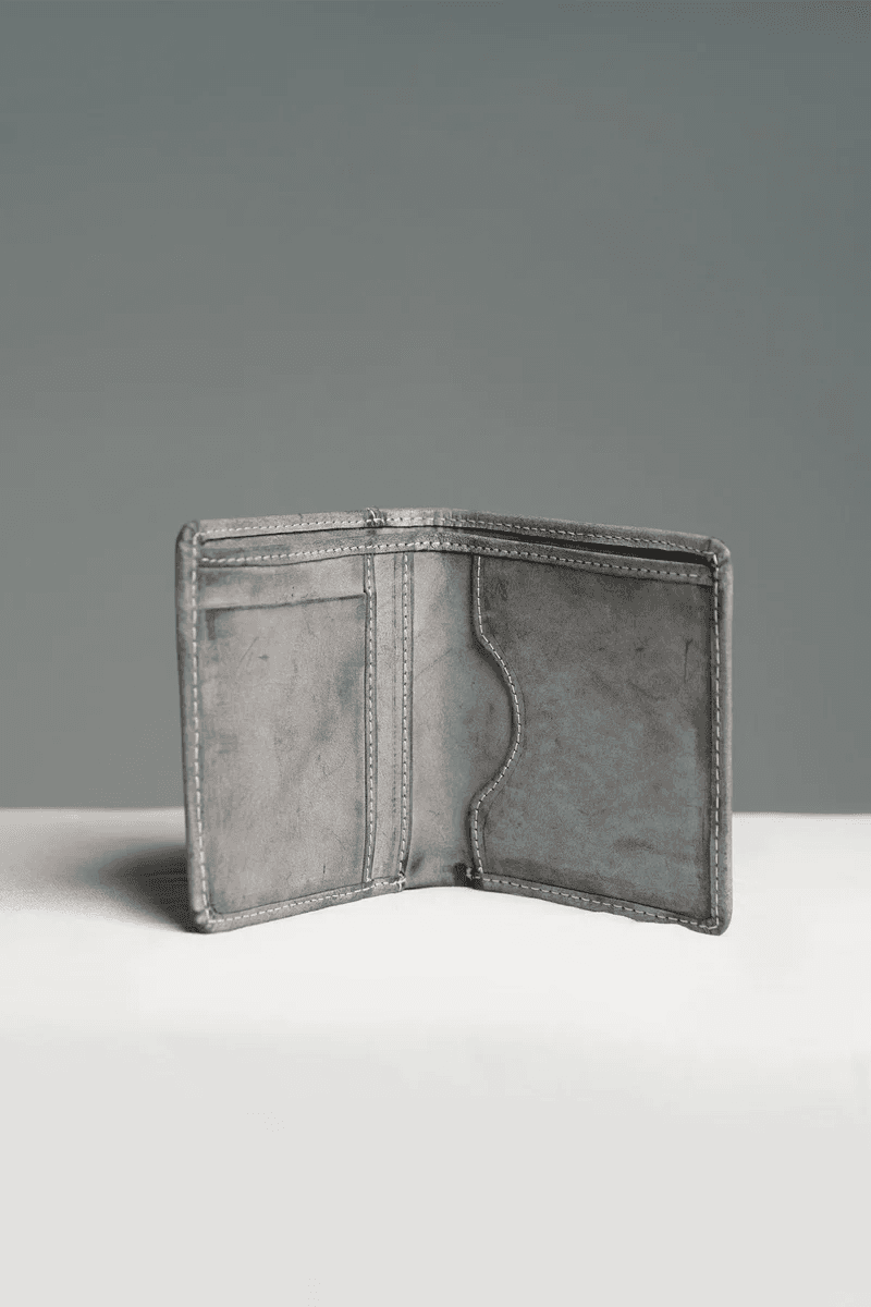 leather wallet highlights and celebrates individuality with it’s two-toned charcoal and vapor grey bases and unique construction