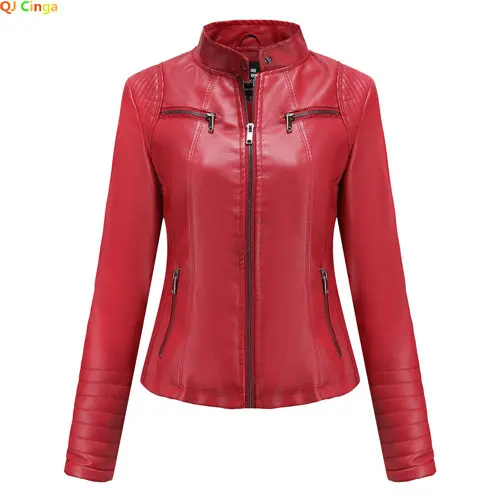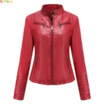 Bright Red V-neck Leather Jacket Women’s Fashion Slim PU Coat Black Short Outerwear